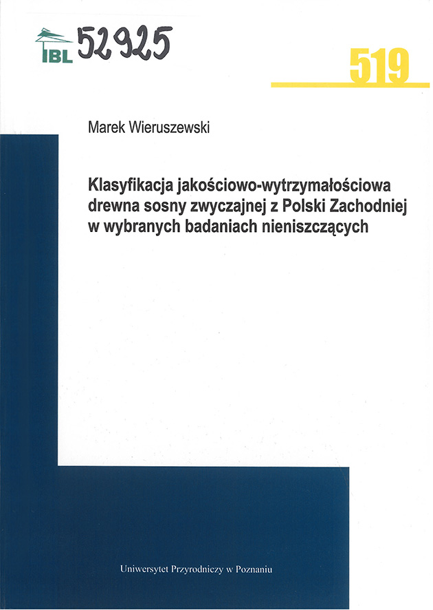 Wieruszewski M., Klasyfikacja jakościowo-wytrzymałościowa drewna sosny zwyczajnej z Polski Zachodniej w wybranych badaniach nieniszczących, Poznań, 2019.