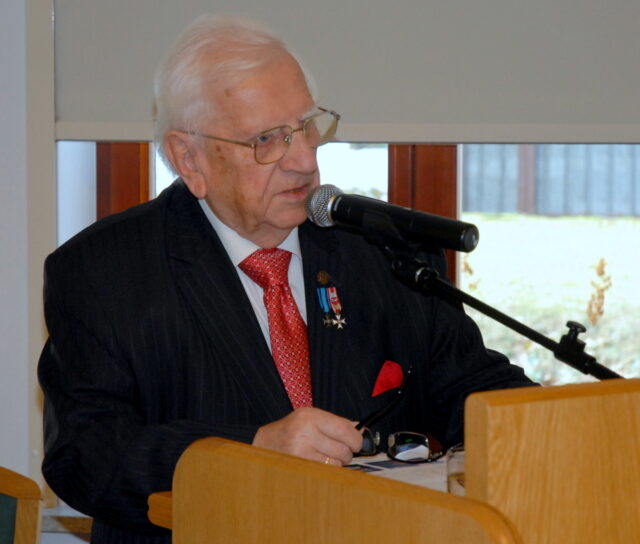 Złoty Kordelas Leśnika Polskiego wręczony Profesorowi Tytusowi Karlikowskiemu podczas uroczystości 50-lecia Samodzielnej Pracowni Ochrony Przeciwpożarowej Lasu