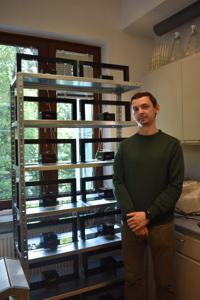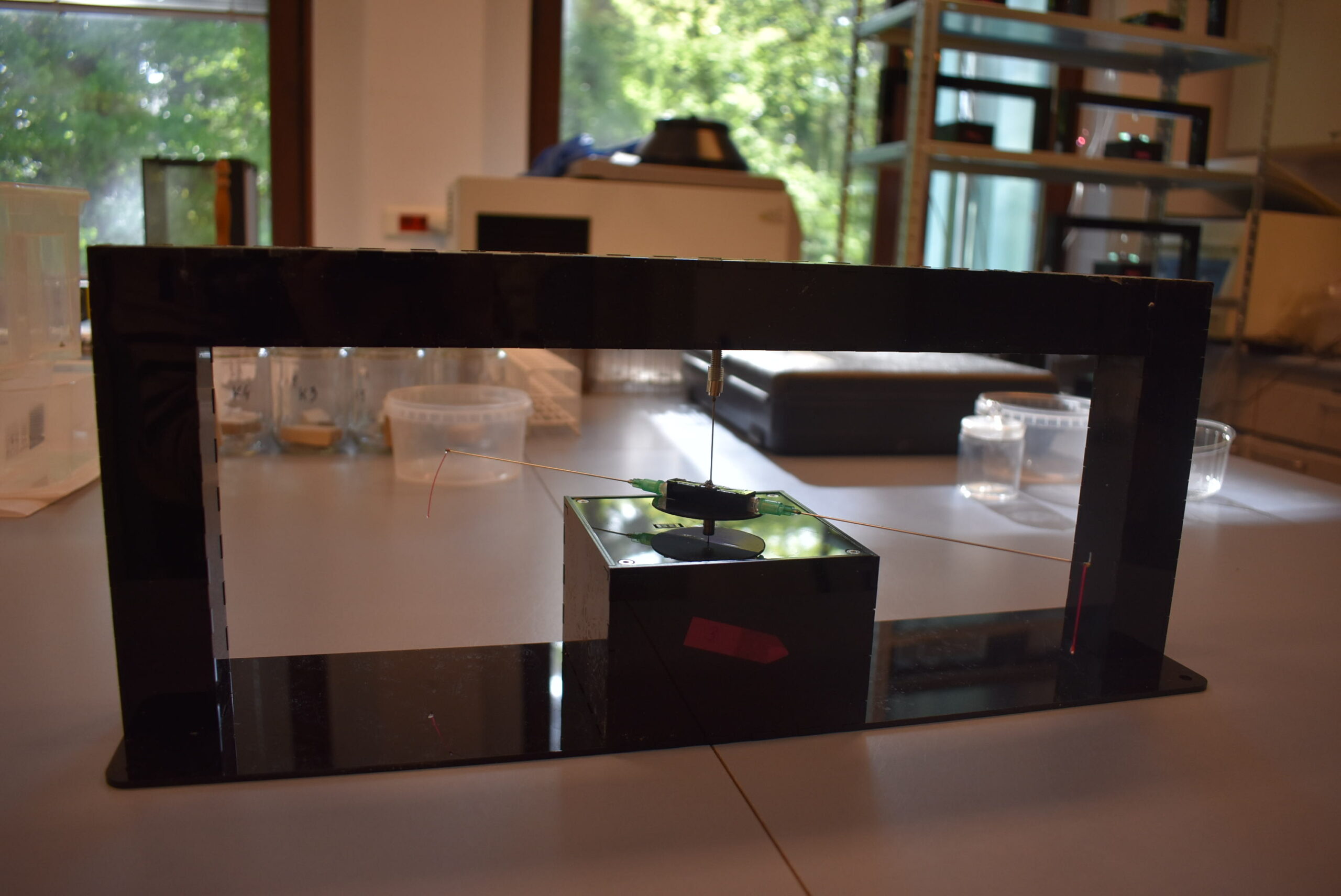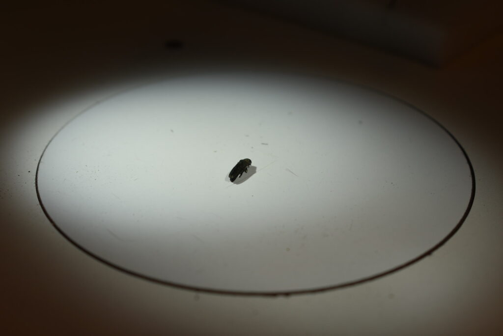 • Zdolności dyspersyjne badane są przy pomocy urządzeń Flight mill (młynków), na których przymocowany owad wykonuje lot po okręgu. Dedykowana aplikacja zlicza dystans jaki owad przeleciał. Badania wykonywane są we współpracy z Wydziałem Leśnym Uniwersytetu Rolniczego im. Hugona Kołłątaja w Krakowie.