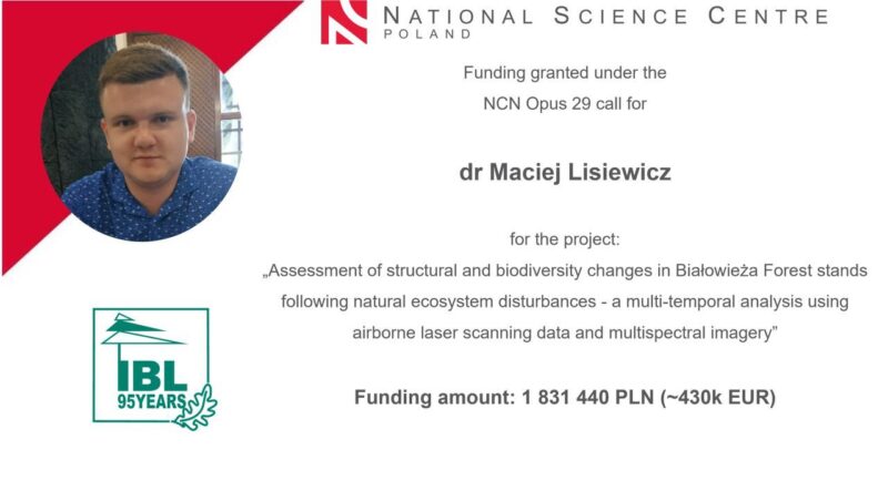 Instytut Badawczy Leśnictwa informuje, że dr Maciej Lisiewicz otrzymał grant Narodowego Centrum Nauki w ramach konkursu OPUS 29. Projekt dotyczy analizy wpływu naturalnych zaburzeń na strukturę i bioróżnorodność drzewostanów Puszczy Białowieskiej.