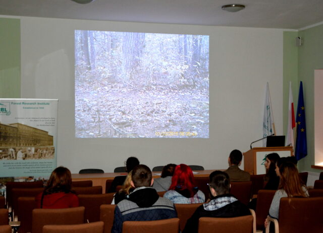 Młodzież wysłuchała prezentacji nt. Puszczy Białowieskiej przygotowanej przez organizatorów w auli Technikum Leśnego w Białowieży