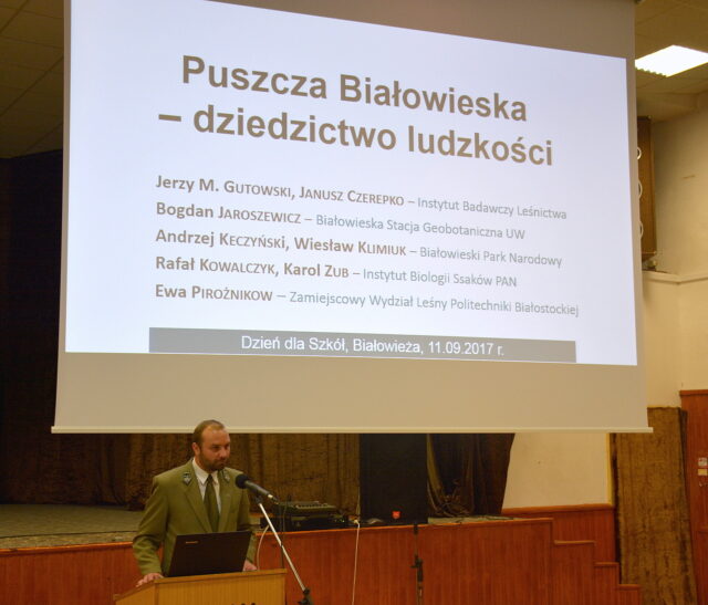 Wydarzenie rozpoczęło się w auli Technikum Leśnego w Białowieży powitaniem gości przez Dyrektora Technikum Leśnego, mgr inż. Mariusza Tokajuka. Następnie przedstawiciele czterech instytucji organizujących XXI Festiwal Nauki w Białowieży: dr hab. Janusz Czerepko – dyrektor IBL, dr Ewa Pirożnikow – ZWLPB, dr hab. Rafał Kowalczyk – dyrektor IBS PAN i mgr inż. Andrzej Keczyński – BPN, wygłosili prezentację na temat walorów przyrodniczych i naukowych Puszczy Białowieskiej. Dyrektor mgr inż. Mariusz Tokajuk, zachęcił uczniów szkół gimnazjalnych do rozpoczęcia nauki w prowadzonej przez Niego szkole, po czym zaprezentował film przedstawiający informację dotyczącą Technikum Leśnego w Białowieży.