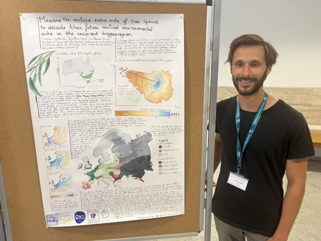 Wydarzenie stanowi kontynuację zeszłorocznego spotkania poświęconego ekosystemom leśnym, które miało miejsce w czerwcu 2024 r. Uczestnicy zeszłorocznej szkoły zostali zaproszeni do przygotowania posterów prezentujących ich pracę badawczą. Wszystkie prace były wartościowe i inspirujące. Jednak jeden z autorów – Tristan Ubaldi – zrobił coś absolutnie wyjątkowego. W świecie cyfrowych narzędzi i wykresów, Tristan własnoręcznie namalował swój poster, nadając swojej prezentacji osobisty i artystyczny wymiar, który zapadł w pamięć wszystkim uczestnikom. Poniżej zamieszczamy zdjęcie Tristana z jego pracą, która stała się symbolem kreatywnego podejścia do nauki.