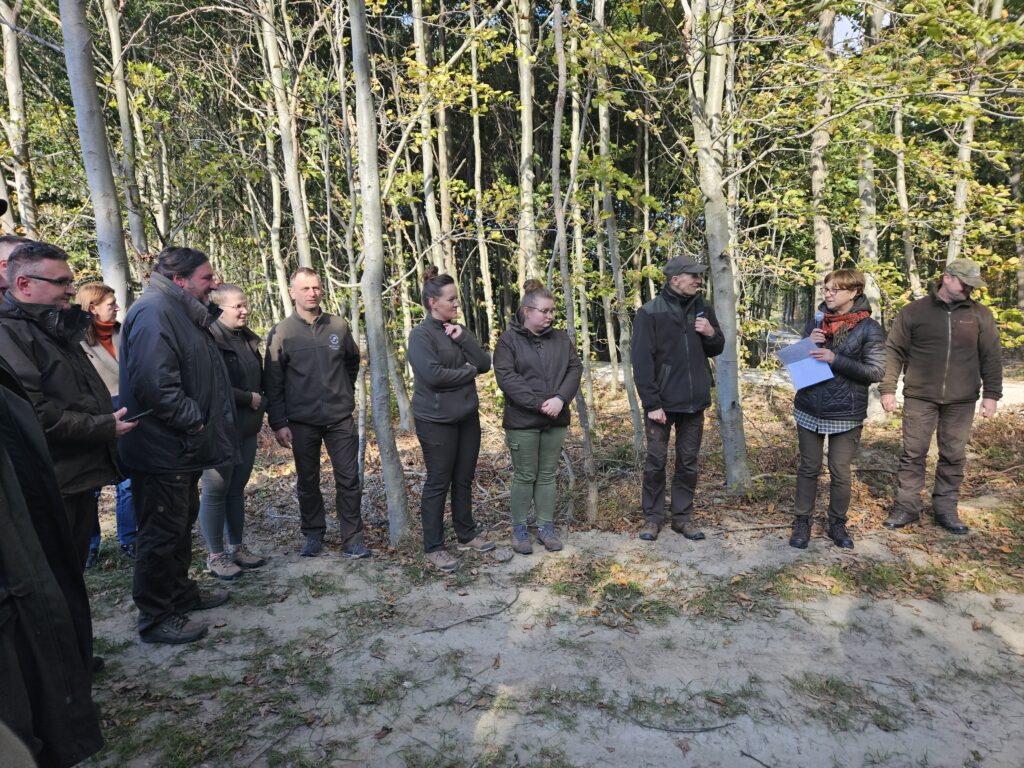 Uczestnicy konferencji w trakcie sesji terenowej w Nadleśnictwie Gołąbki