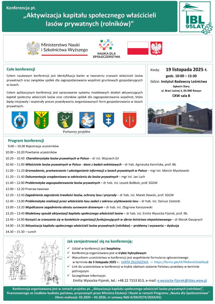 Już 19 listopada 2025 r. w Instytucie Badawczym Leśnictwa odbędzie się konferencja pt.: „Aktywizacja kapitału społecznego właścicieli lasów prywatnych (rolników)”.