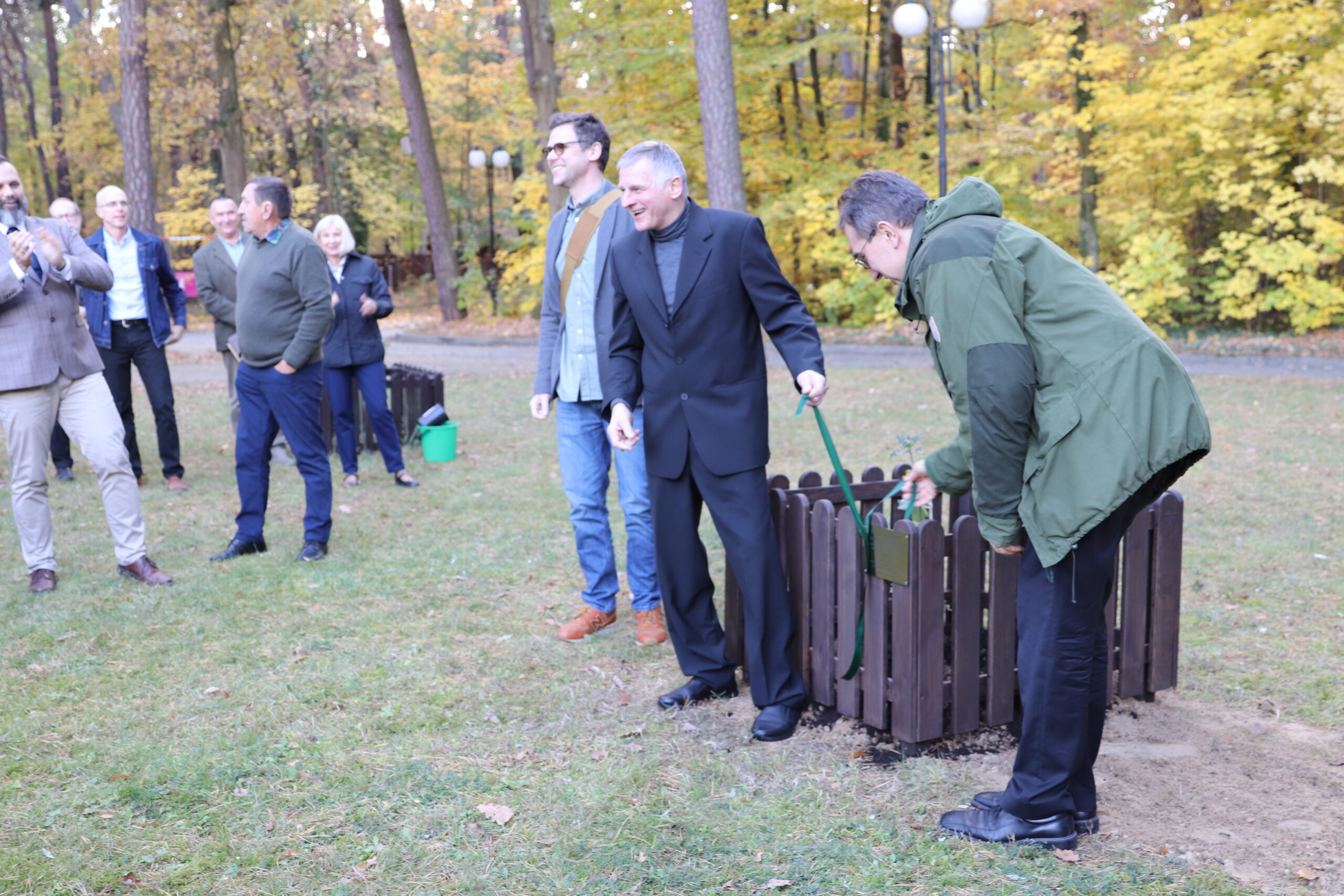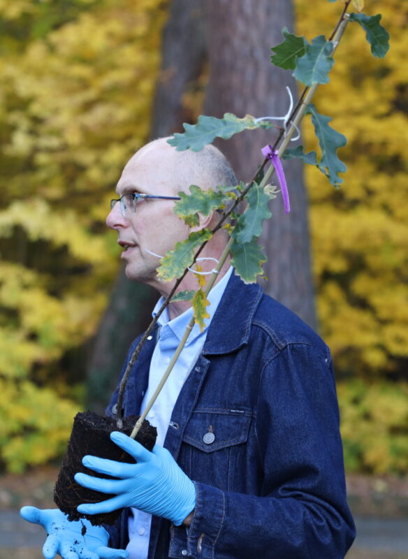 Prof. dr hab. Paweł Chmielarz z Instytutu Dendrologii PAN w Kórniku prezentuje genetyczną kopię ok. 800 -letniego dębu „Rus”, który od teraz nosi nazwę „Tyszkiewicz”