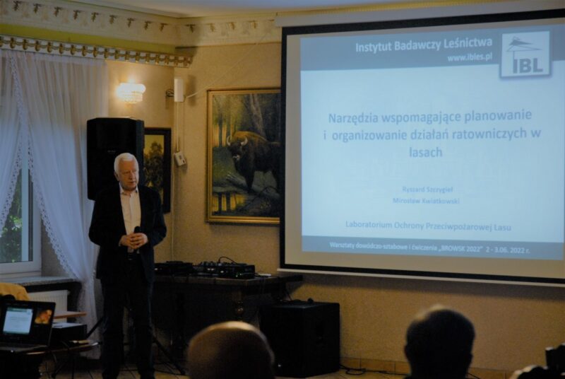 Dr hab. Ryszard Szczygieł – kierownik Laboratorium Ochrony Przeciwpożarowej Lasu, przybliżył słuchaczom jakie narzędzia mogą wspomagać działania ratowniczo-gaśnicze