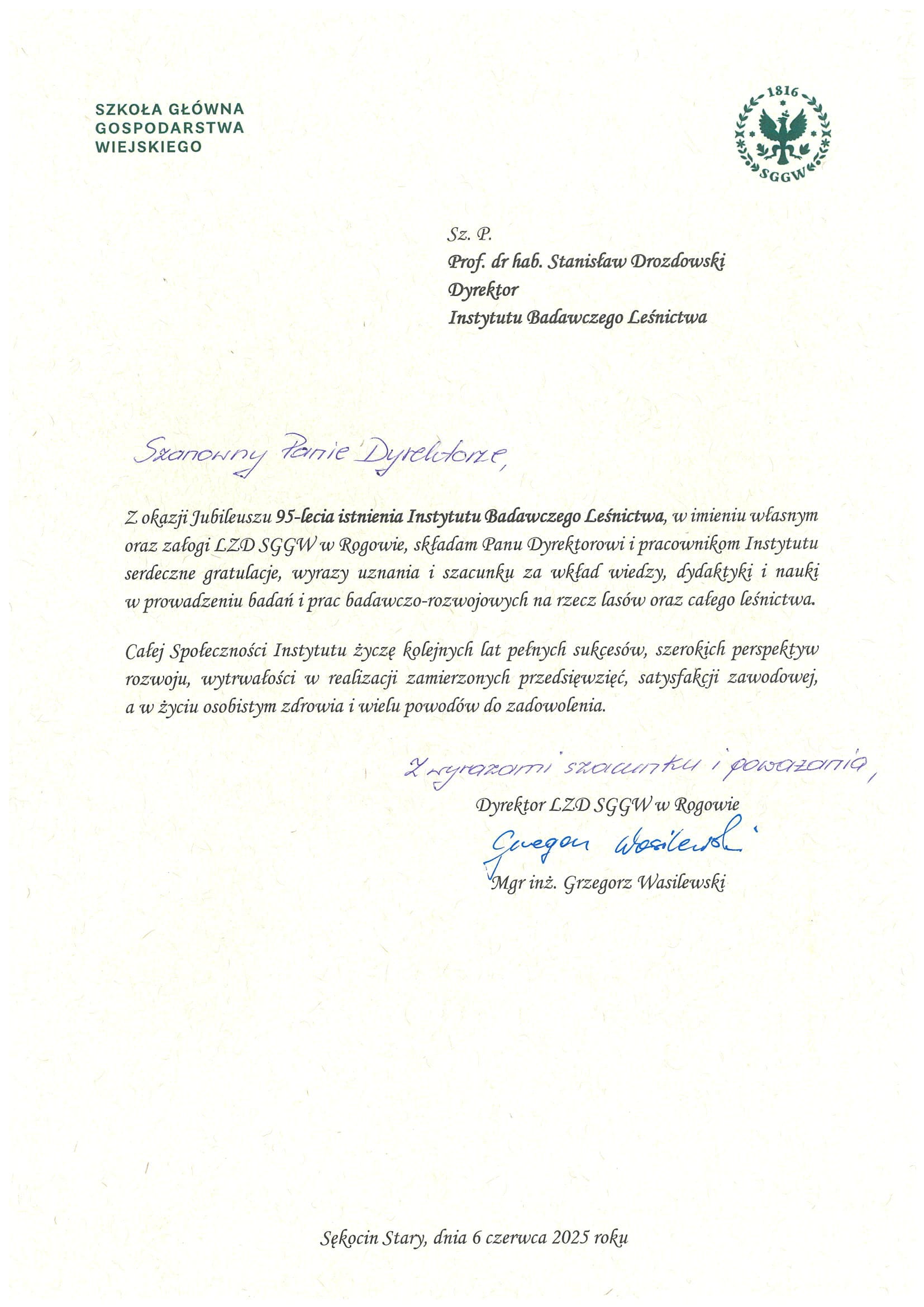 6 czerwca 2025 roku złożeniem kwiatów pod pomnikiem pierwszego dyrektora Jana Teodora Hausbrandta rozpoczęły się uroczyste obchody 95-lecia Instytutu Badawczego Leśnictwa – wydarzenia o wyjątkowym znaczeniu dla całego środowiska leśników, naukowców i sympatyków przyrody.
