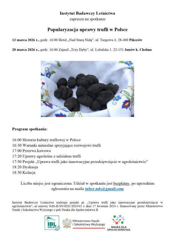 Instytut Badawczy Leśnictwa zaprasza na spotkania organizowane w ramach projektu pt. „Uprawa trufli jako innowacyjne przedsięwzięcie w agroleśnictwie”, finansowanego przez Ministerstwo Nauki i Szkolnictwa Wyższego w ramach programu Nauka dla Społeczeństwa II. Wydarzenia poświęcone będą popularyzacji uprawy trufli w Polsce.