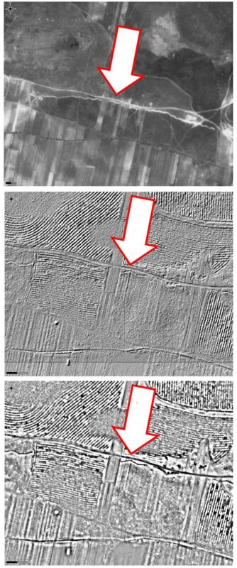 Fragment tego samego terenu – wizualizacja danych lotniczego skanowania laserowego – przetworzenie danych typu local relief model (po środku). Widoczne fragmentarycznie zachowane zarysy okopów. Tereny obecnie zalesione: powiat wołomiński – Nadleśnictwo Drewnica / RDLP w Warszawie. Źródło danych: CODGiK.