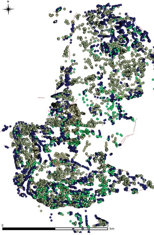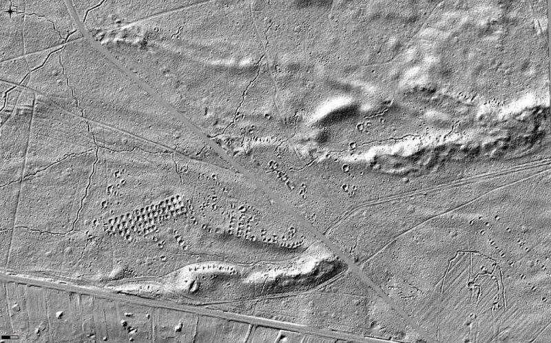 Przykładowa wizualizacja danych lotniczego skanowania laserowego z pozostałościami różnorodnych konfliktów zbrojnych z XX wieku oraz innymi zabytkami archeologicznymi. Tereny obecnie zalesione: powiat wołomiński – Nadleśnictwo Jabłonna. Źródło danych: CODGiK