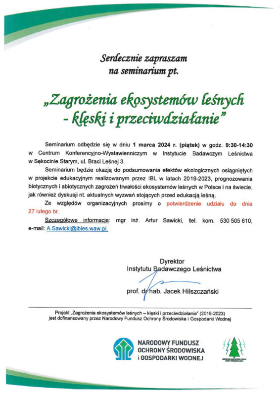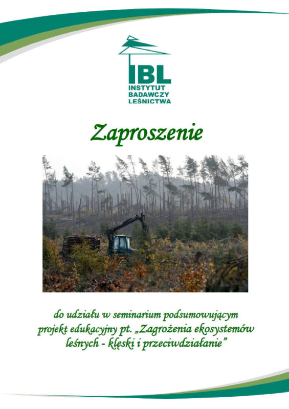 Instytut Badawczy Leśnictwa zaprasza do udziału w w seminarium podsumowującym projekt edukacyjny pt. „Zagrożenia ekosystemów leśnych – klęski i przeciwdziałanie”, które odbędzie się w dniu 1 marca 2024 r. (piątek) w godz. 9:30-14:30 w Centrum Konferencyjno-Wystawienniczym IBL w Sękocinie Starym, ul. Braci Leśnej 3.