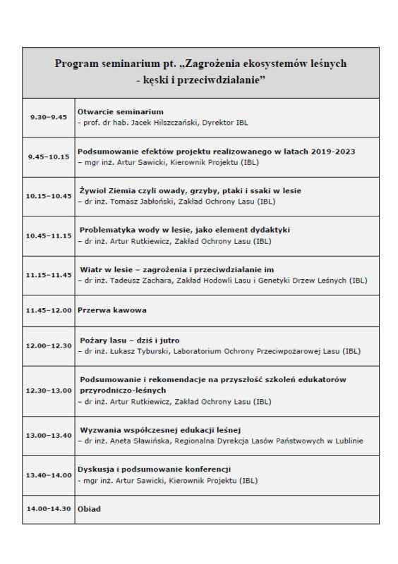 Seminarium będzie okazją do podsumowania efektów ekologicznych osiągniętych w projekcie edukacyjnym realizowanym przez IBL w latach 2019-2023, prognozowania biotycznych i abiotycznych zagrożeń trwałości ekosystemów leśnych w Polsce i na świecie, jak również do dyskusji nt. aktualnych wyzwań stojących przed edukacją leśną.