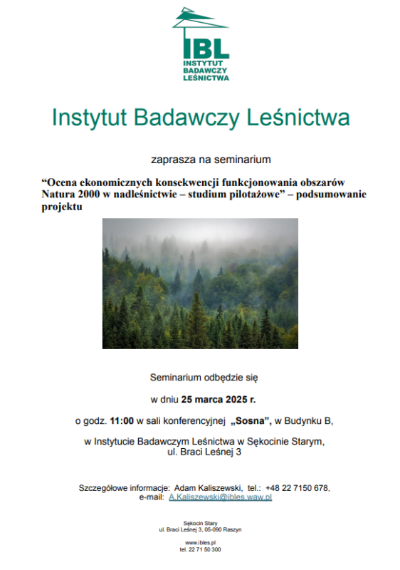W imieniu Dyrekcji Instytutu Badawczego Leśnictwa oraz Prelegentów serdecznie zapraszamy do udziału w seminarium naukowym pt. „Ocena ekonomicznych konsekwencji funkcjonowania obszarów Natura 2000 w nadleśnictwie – studium pilotażowe” – podsumowanie projektu.