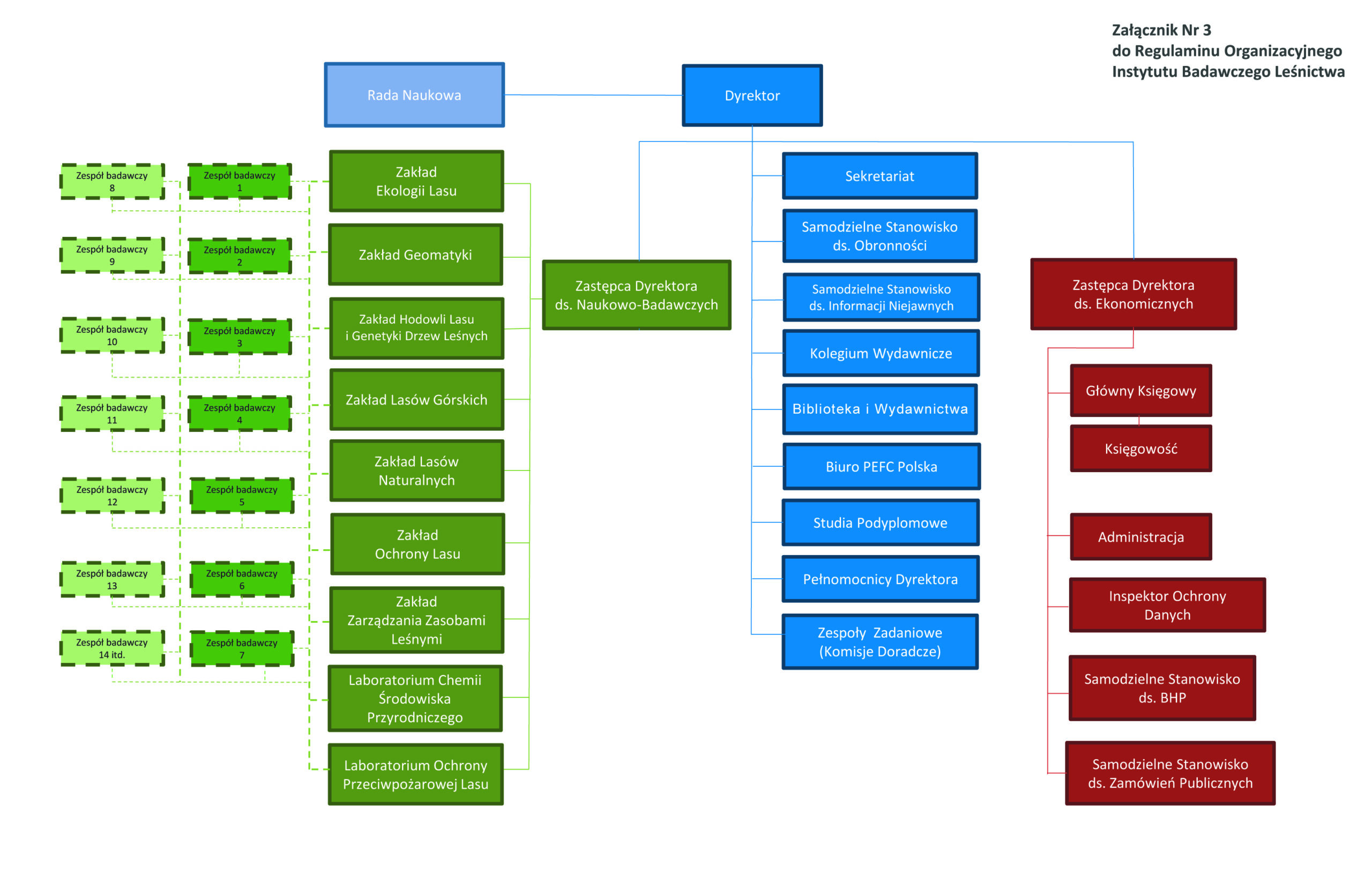 Struktura organizacyjna Instytutu Badawczego Leśnictwa wynika z Załacznika Nr 14 do Zarządzenia Nr 6 Dyrektora IBL z dn. 16 grudnia 2019 r. w sprawie Regulaminu organizacyjnego Instytutu Badawczego Leśnictwa